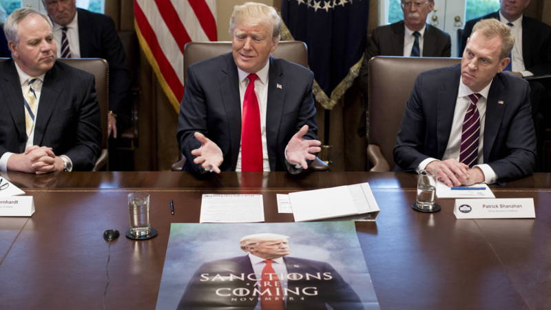 Toen Trump de pers te woord stond, lag een poster op tafel. Daarop was, in de stijl van de tv-serie Game of Thrones, een foto van Trump te zien met daarbij de tekst ‘sanctions are coming’, vrij vertaald: er hangen sancties in de lucht. De tekst refereert aan sancties die Trump wil instellen tegen IraniĂ«rs.