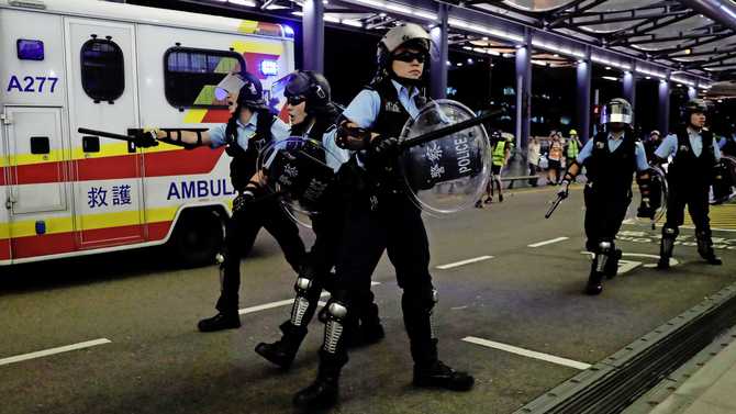 Demonstranten en politie zijn vandaag op de internationale luchthaven van Hongkong met elkaar in botsing gekomen, nadat vertrekkende vluchten voor de tweede dag waren verstoord.