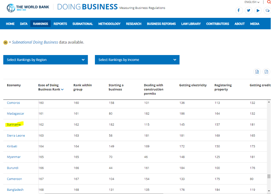 Terwijl de president tijdens zijn bezoek aan Nederland in het tv-programma College Tour schaamrood beloofde om zaken aan te pakken, gaan corruptie, drugshandel en nepotisme onverminderd door. Suriname staat volgens de Wereldbank op plaats 162 van de Doing business-lijst voor eenvoudig zakendoen.