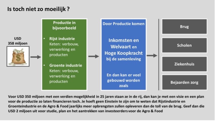 Het oogt op amateurisme, het heeft alles weg van verkeerde egotripperij. Het lijkt alsof de regering een bouwwerk met hun naam wil achterlaten. In dat geval heb ik een goed advies voor betere ego streling: INVESTERING IN PRODUCTIE! Daarmee komt veel geld en een duurzame ontwikkeling. Dan kunnen er meerdere bruggen en havens gebouwd worden. Dat is betere ego streling.