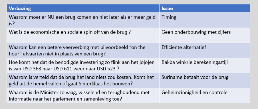 Wij zien dat minister Nurmohamed heel vaag en wazig is met informatie. Hij heeft steeds ‘geweigerd’ de plannen met het parlement te delen en nu komt de informatie in delen naar buiten en wij zien dat hij een verkeerde volgorde heeft gekozen, hij heeft al zinloos meer dan US$ 2 miljoen uitgegeven en hij heeft gejokt dat de brug het land niets gaat kosten want het kost nu al meer dan US$ 2 miljoen en die investering kost rente die doorbelast zal worden. En aan het eind van de looptijd zal Suriname zeker nog een restant betalen.