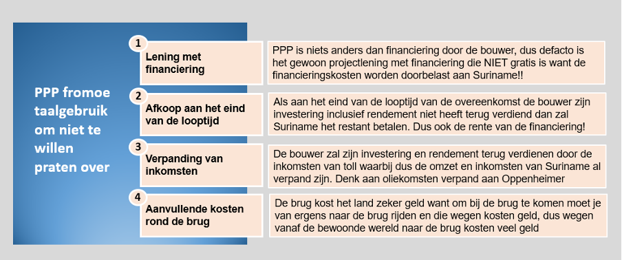 Ook de hele PPP fromu tori (public private partnership) kost het land en volk geld, maar het wordt wel gebracht als “no span, wij lenen niet”.