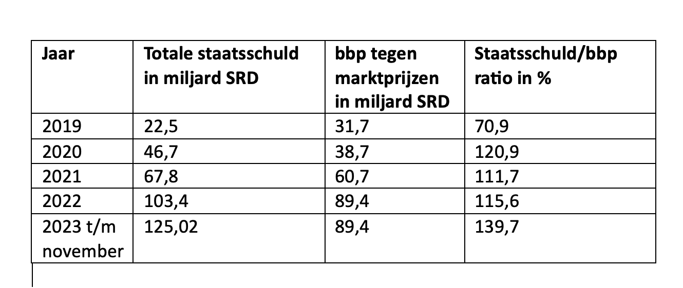 Eenieder kan aflezen dat de staatsschuld behoorlijk is toegenomen. Van SRD 22,5 miljard in 2019 naar SRD 125,02 miljard tot en met november 2023. Een stijging van de totale staatsschuld met SRD 102,52 miljard. Beoordeelt u zelf hoe grof er leugens verspreid worden via de page van de regeringsleider. Zie ook de staatsschuld/bbp ratio. Alleen de regeringsleider ziet een daling in deze ratio.