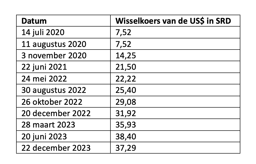 Echter vergeet hij hierbij te vermelden dat de wisselkoers op 14 juli 2020 SRD 7,52 was voor US$ 1. De ontwaarding van de SRD is in de onderstaande tabel te zien. De data zijn afkomstig van de website van CBvS en kan gecontroleerd en geverifieerd worden.