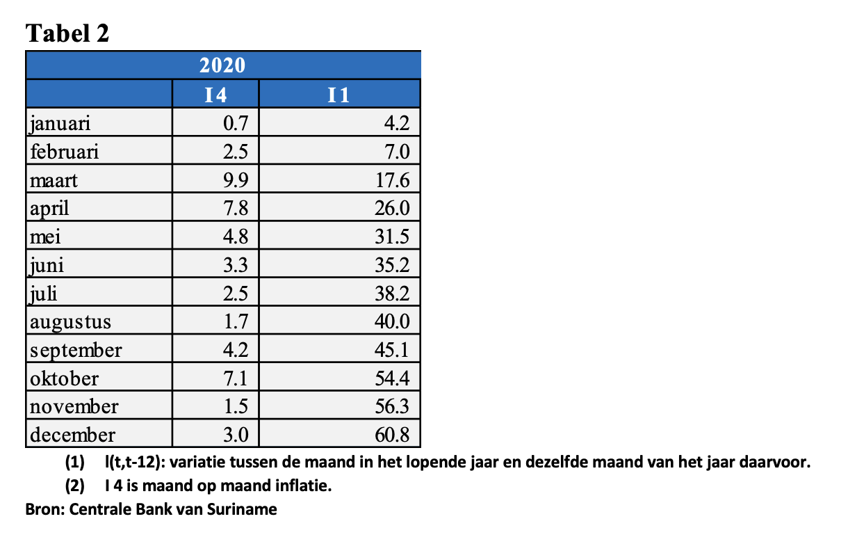 In tabel 2 zien we dat de maand-op-maandinflatie in januari (4,2 procent) en februari 2020 (7,0 procent) nog vrij laag was. De covid-19-pandemie had ook een ingrijpende impact op de Surinaamse economie, vooral in de aanloop naar de verkiezingen van 2020.