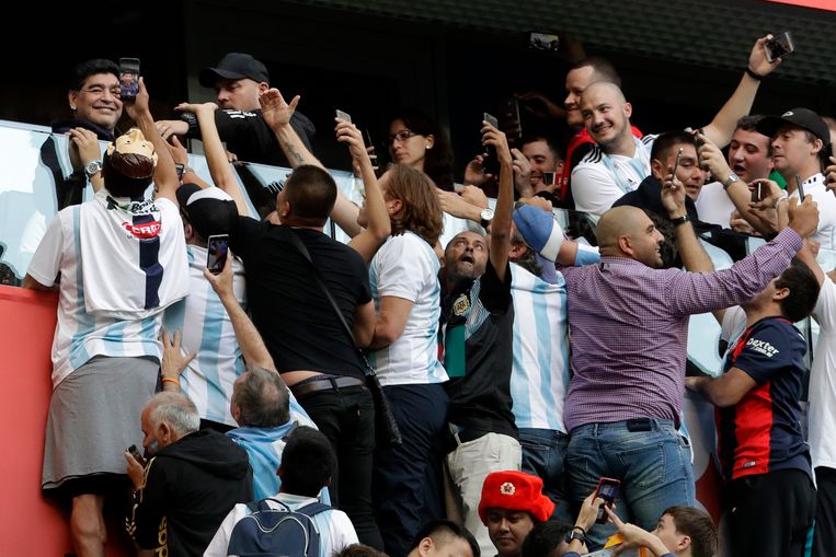 De nog altijd maar 57-jarige legende bouwde zijn eigen feestje op de tribunes, terwijl hij duidelijk in hogere sferen verkeerde. ‘Pluisje’ danste met een andere supporter, maakte obscene gebaren, viel in slaap en moest na de match zelfs uit het stadion worden gedragen. Pijnlijk. Volgens sommige bronnen werd Maradona inmiddels zelfs afgevoerd naar het ziekenhuis.