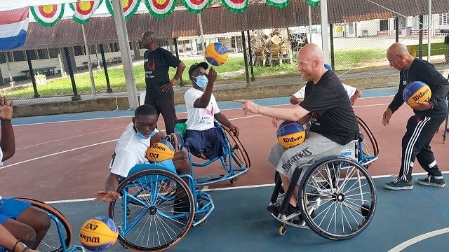 Speciaal voor dit alles reisden vanuit Nederland vier trainers naar Suriname af. Het gaat om Gertjan van der Linden (coach van het Nederlands dames rolstoelbasketbalteam), Nico Teunissen (voorzitter van het Fonds Kind & Handicap), Mark Aalders (ex-international Nederlands rolstoelbasketbalteam en clinic instructeur van Basketball Experience NL BEN) en Martin Ho Sui Sang (program manager basketball development van de Nederlandse Basketbalbond). Aan het eind van het ‘Train-the-Trainer’ programma namen de 24 cursisten zondag hun certificaten in ontvangst.