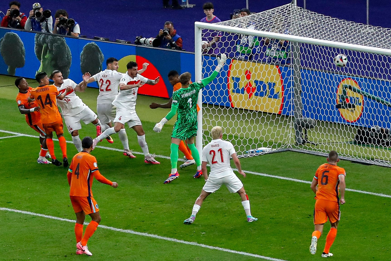 Nederland gaf opvallend veel hoekschoppen weg en de vierde was zelfs een cadeautje. Hoewel Nathan Aké de bal duidelijk raakte, liet Denzel Dumfries de bal bewust over de achterlijn open. Laat die corner nu net de Turkse goal opleveren. Niet direct, maar wel in tweede instantie.