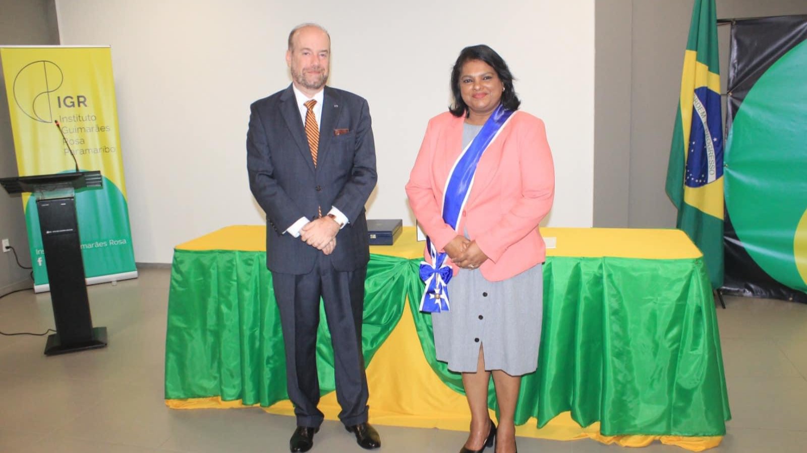 Minister Krishna Mathoera van Defensie heeft onlangs de Grand Cross of the Order of Rio Branco ontvangen, een van de hoogste onderscheidingen die Brazilië aan buitenlandse autoriteiten verleent. De ceremonie vond plaats op het hoofdkantoor van het Instituto Guimarães Rosa (IGR) in Paramaribo.