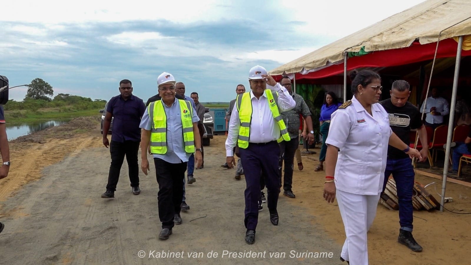 President Santokhi benadrukte bij de ingang van de Karachiweg in de Westelijkepolders het belang van het rehabiliteren van zes waterschappen, terwijl de andere zes waterschappen een grondige onderhoudsbeurt krijgen. Dit is cruciaal voor het verhogen van de rijstproductie.
