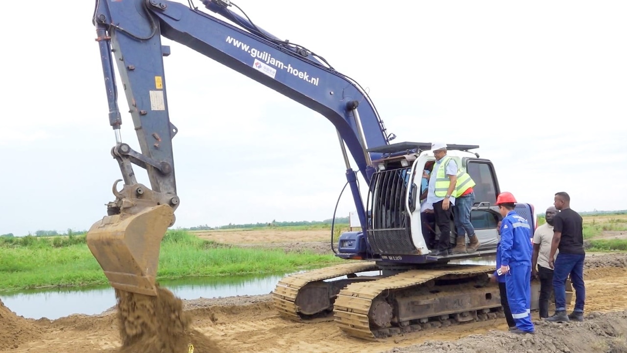 President Chan Santokhi heeft het startsein gegeven voor de uitvoering van drie belangrijke projecten die de rijstsector in het district Nickerie moeten versterken. Deze initiatieven worden gefinancierd door de Inter-Amerikaanse Ontwikkelingsbank (IDB). Tijdens een ceremonie in Wageningen, aan lijn 6, bediende de president symbolisch een graafmachine om de aanleg van een 25 kilometer lange afwateringsleiding op gang te brengen. Deze leiding zal de rijstgebieden aan de rechteroever van de Nickerierivier verbeteren.