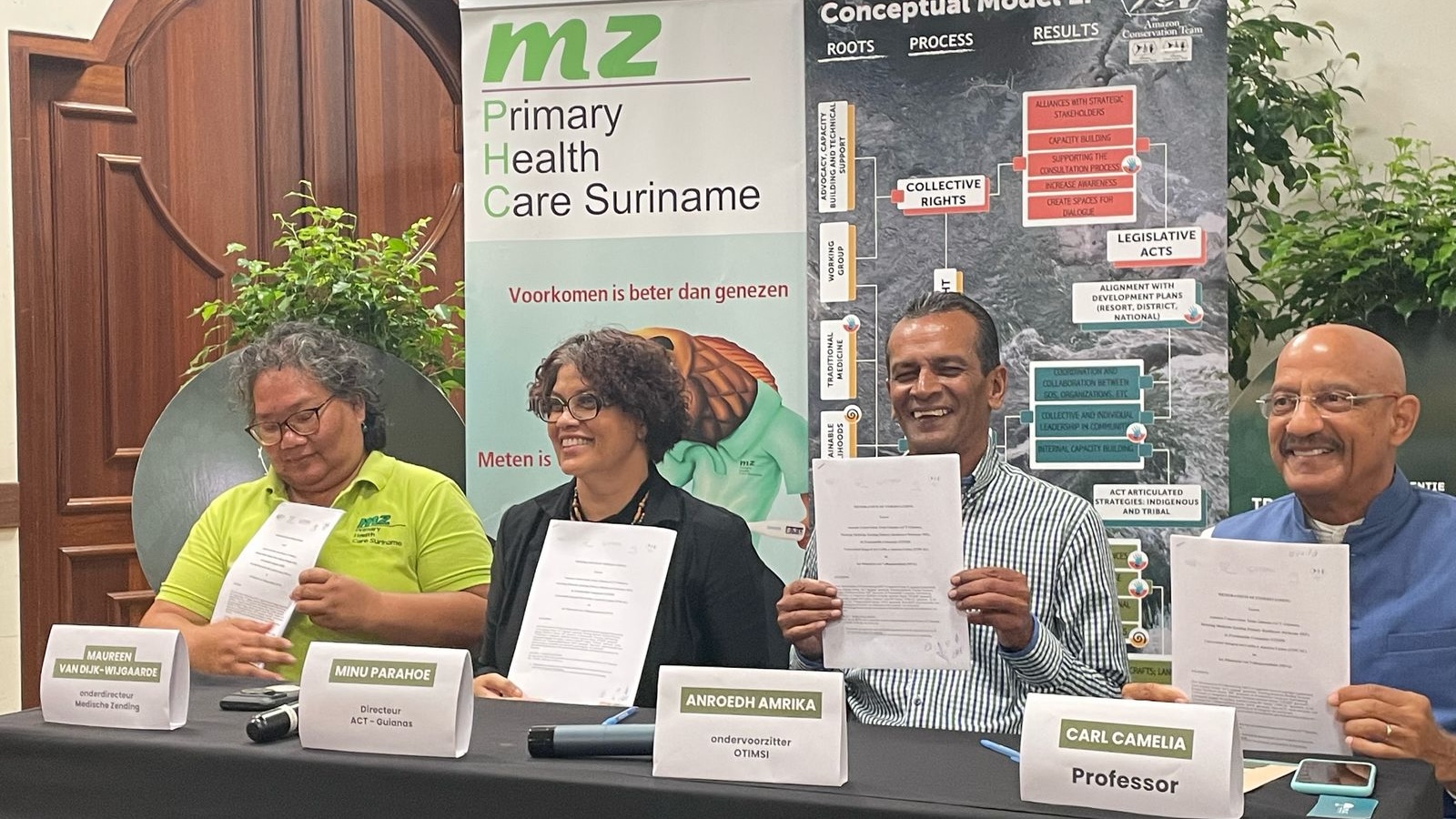 De driedaagse conferentie ‘Traditionele & Integratieve Gezondheidssystemen 2025’ is succesvol afgesloten met de ondertekening van een Memorandum of Understanding (MOU) tussen het ministerie van Volksgezondheid en vier organisaties: ACT-Guianas, Medische Zending Suriname Primary Healthcare (MZ), OTIMSI en UNICAL. De conferentie in Jacana bracht deskundigen, beleidsmakers en beoefenaars samen om de integratie van traditionele en conventionele gezondheidszorg te bevorderen.