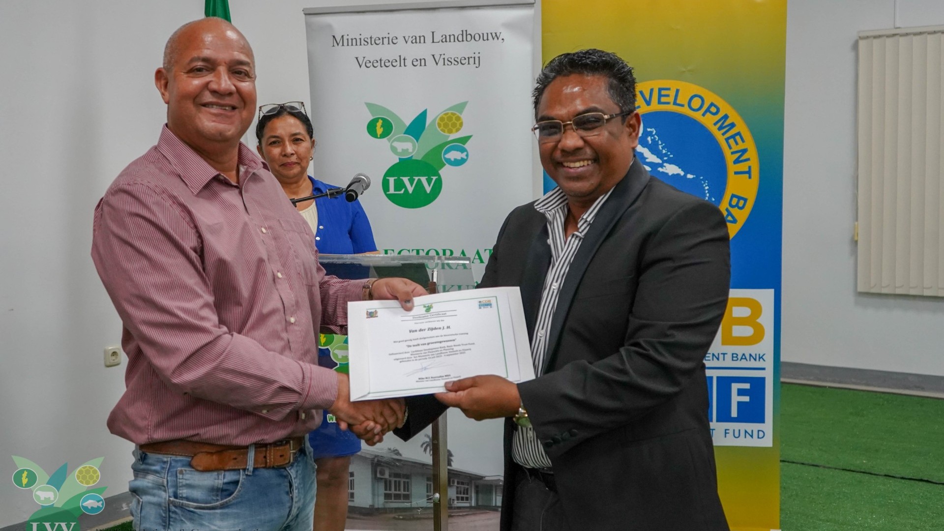 Dertig landbouwers uit de Saramaccapolder en vertegenwoordigers van Stichting Engedi hebben op 3 oktober 2025 hun certificaat in ontvangst genomen na afronding van een theoretische training van het Basic Needs Trust Fund (BNTF). De uitreiking vond plaats op het ministerie van Landbouw, Veeteelt en Visserij (LVV), waar ook deelnemers aan de training rond Goede Agrarische Praktijken (GAP) hun erkenning kregen. Het BNTF-project wordt gefinancierd door de Caribische Ontwikkelingsbank via het ministerie van Financiën en Planning.
