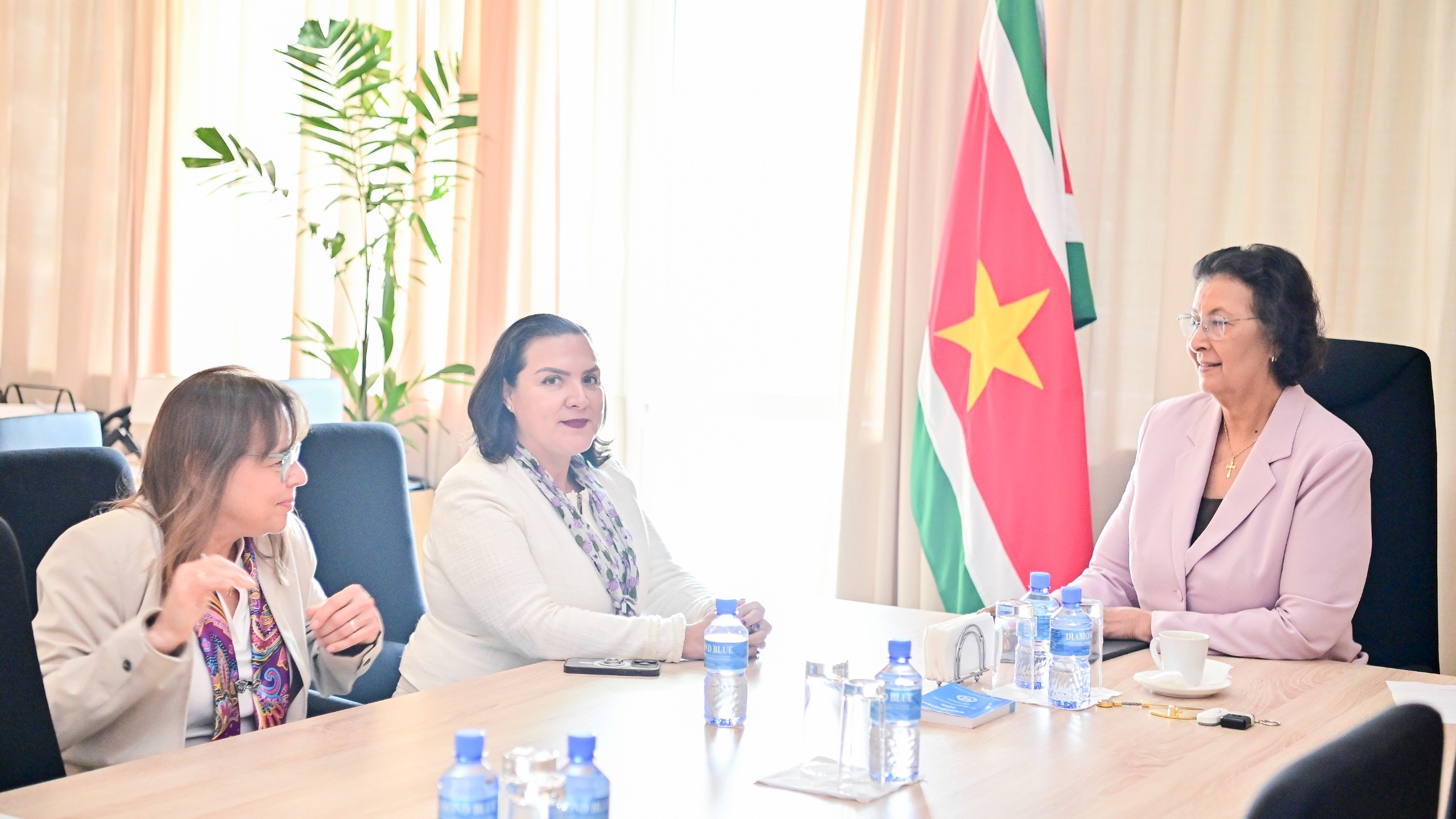 President Jennifer Simons heeft een ontmoeting gehad met Adriana La Valley, landenvertegenwoordiger van de Inter-Amerikaanse Ontwikkelingsbank (IDB) in Suriname. Tijdens het gesprek, dat plaatsvond op het Kabinet van de President, wisselden beide partijen van gedachten over de ontwikkelingsvisie en prioriteiten van de regering voor de komende drie jaar.